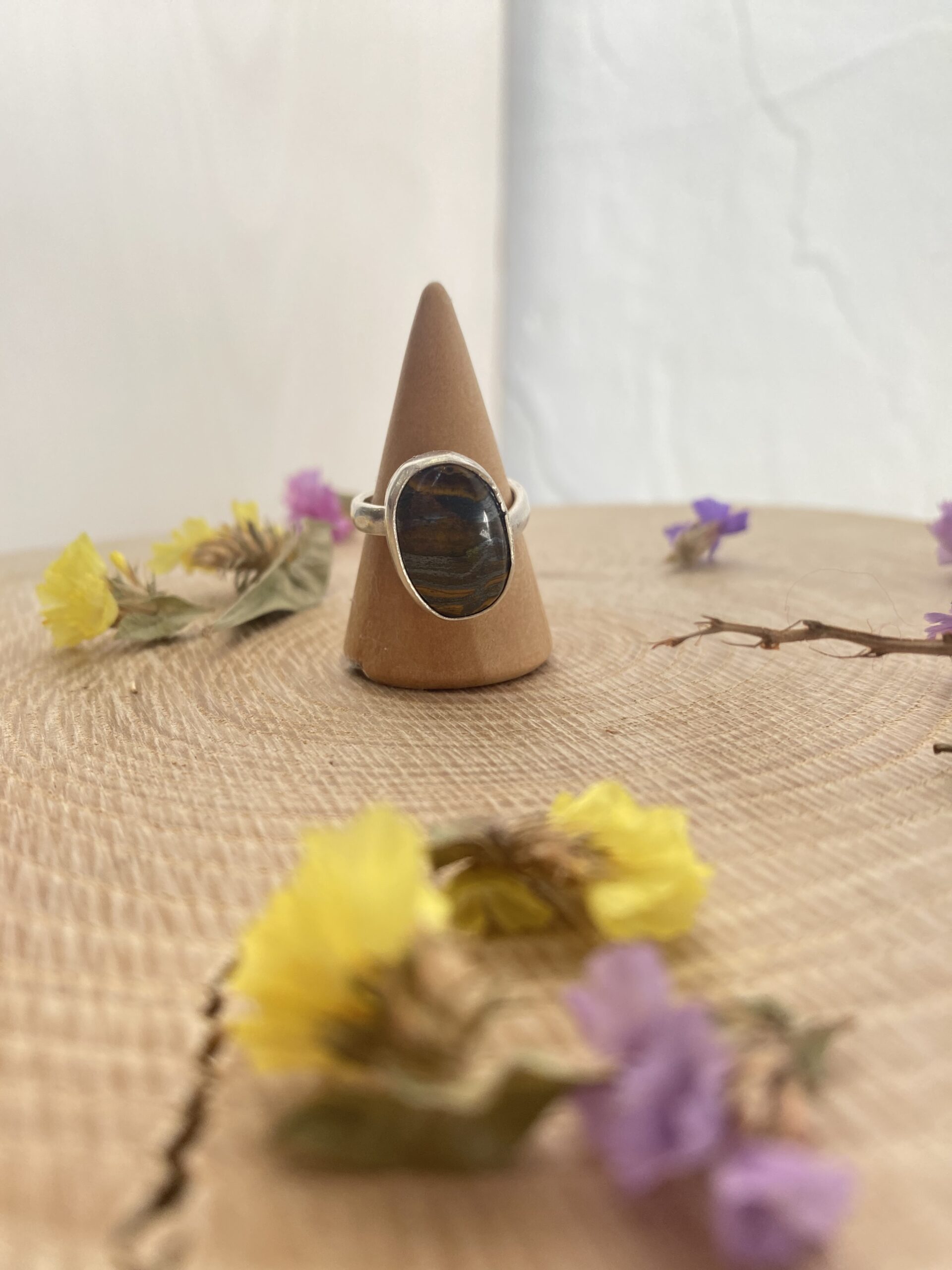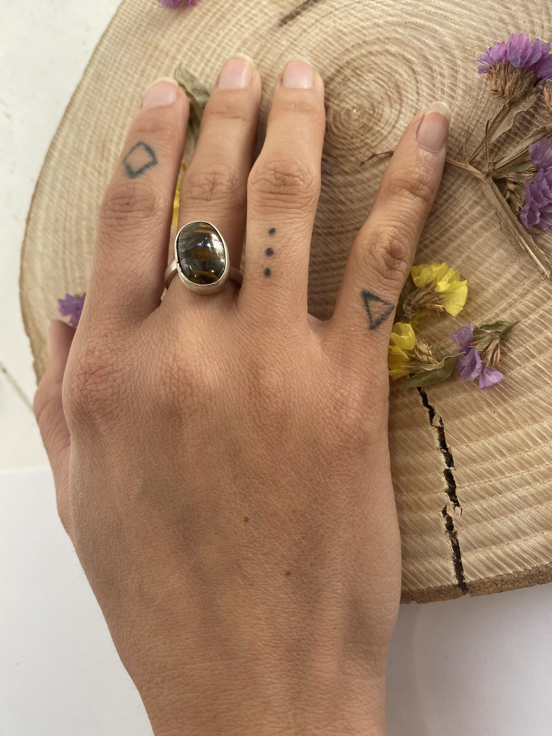 Anillo artesanal de plata 925 ecológica y ojo de tigre de hierro