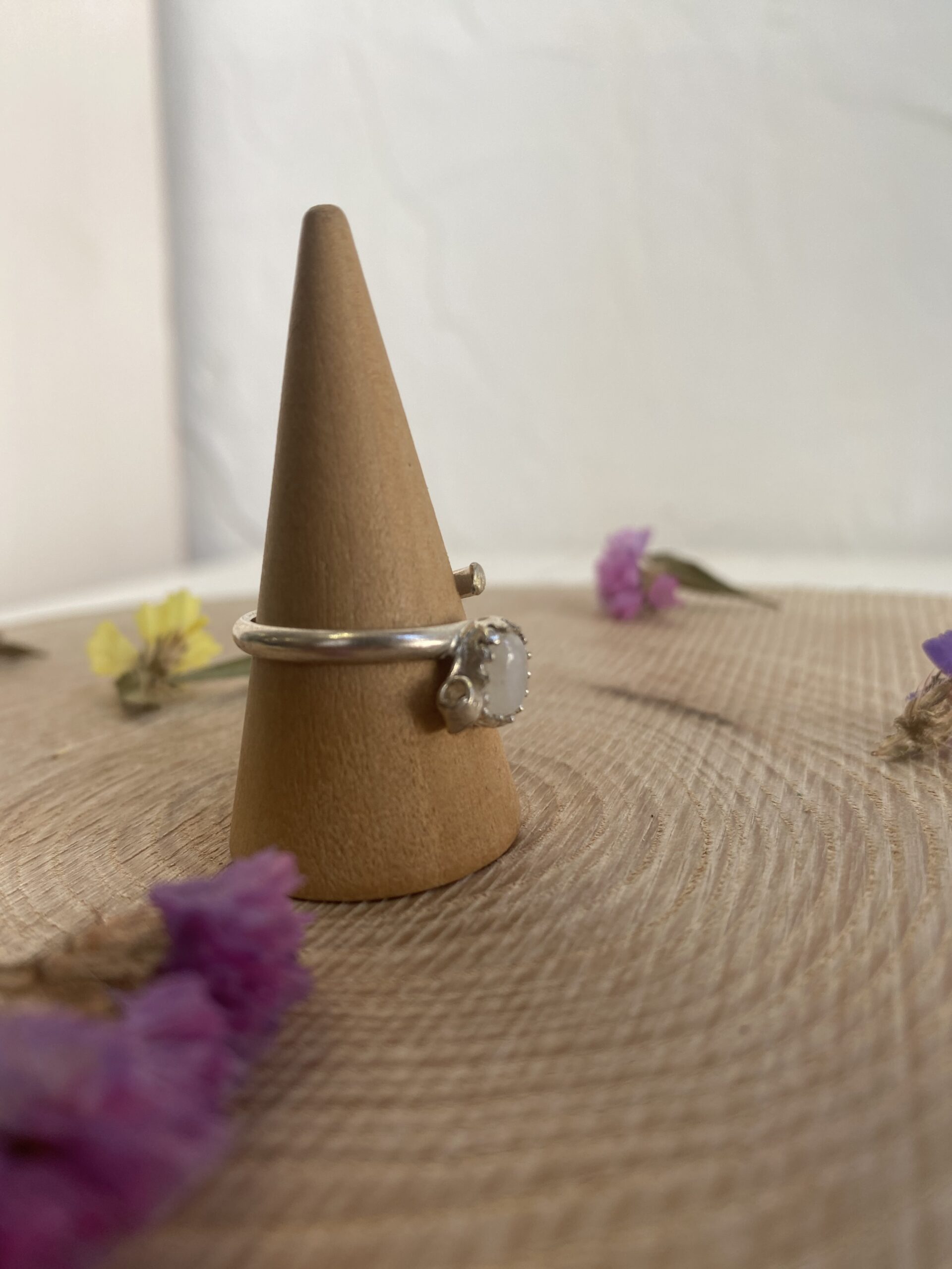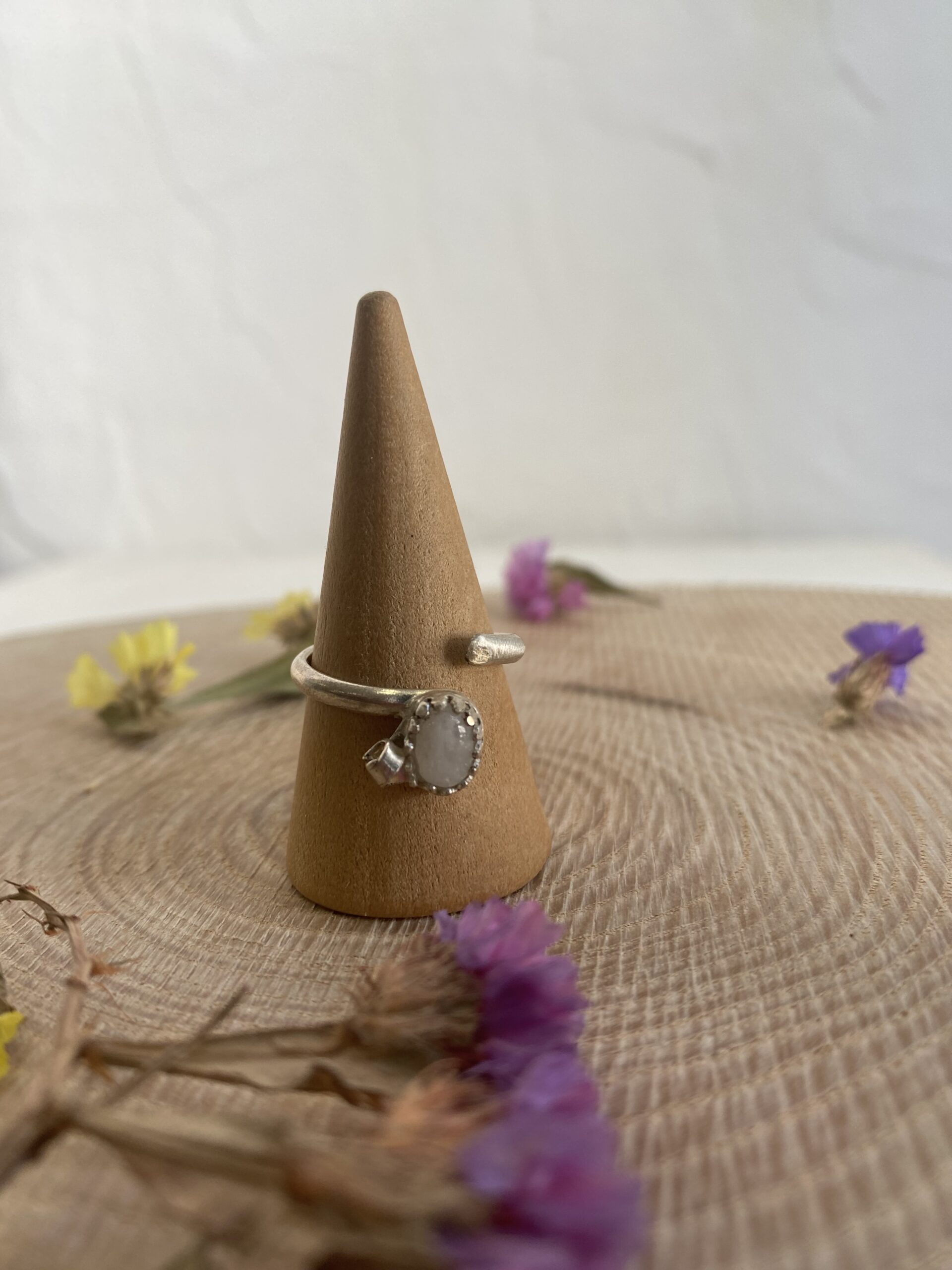 Incorpora labradorita blanca, conocida también como piedra de luna, un mineral de energía suave que conecta con la intuición, la sensibilidad y los ciclos naturales.