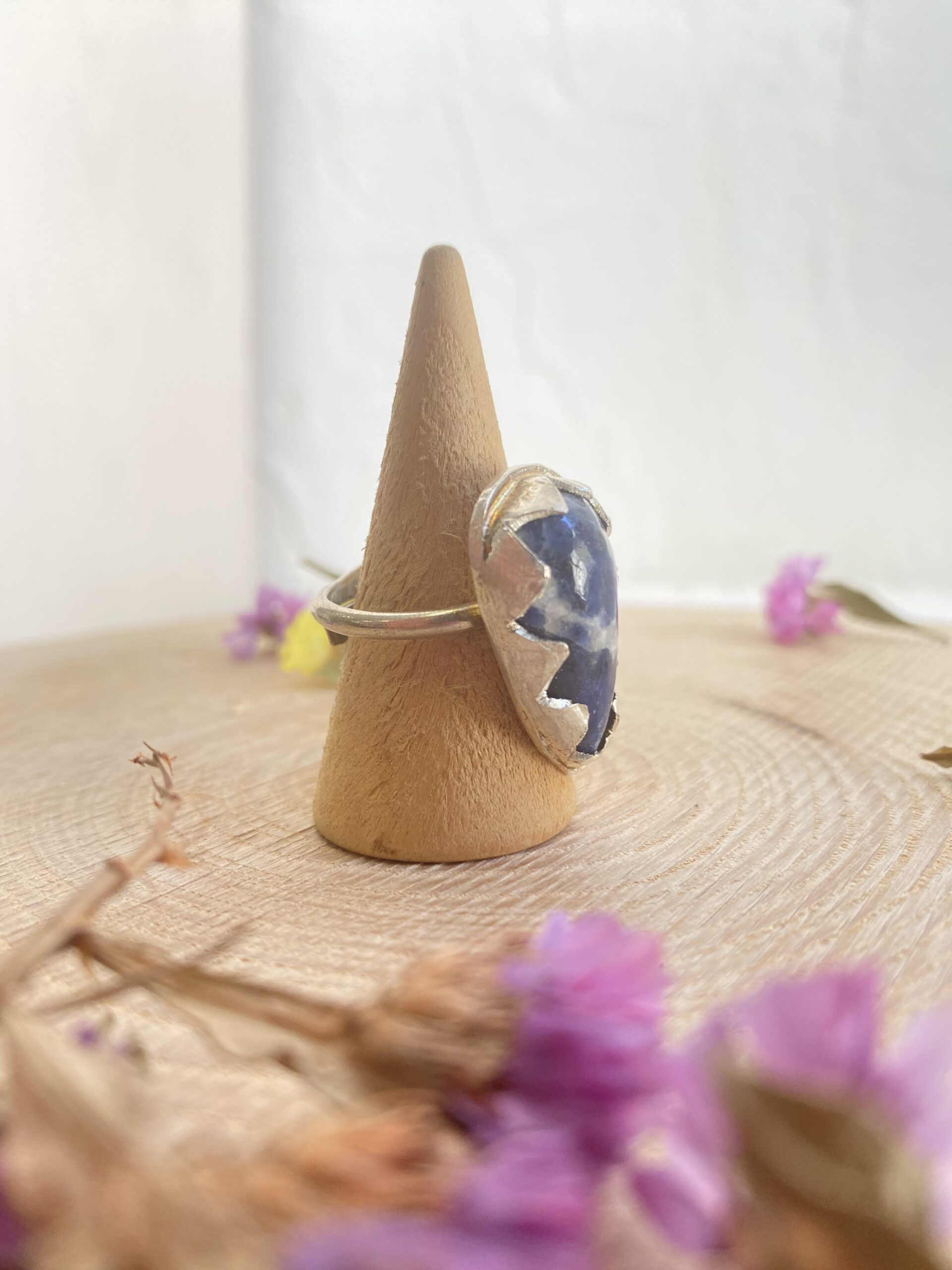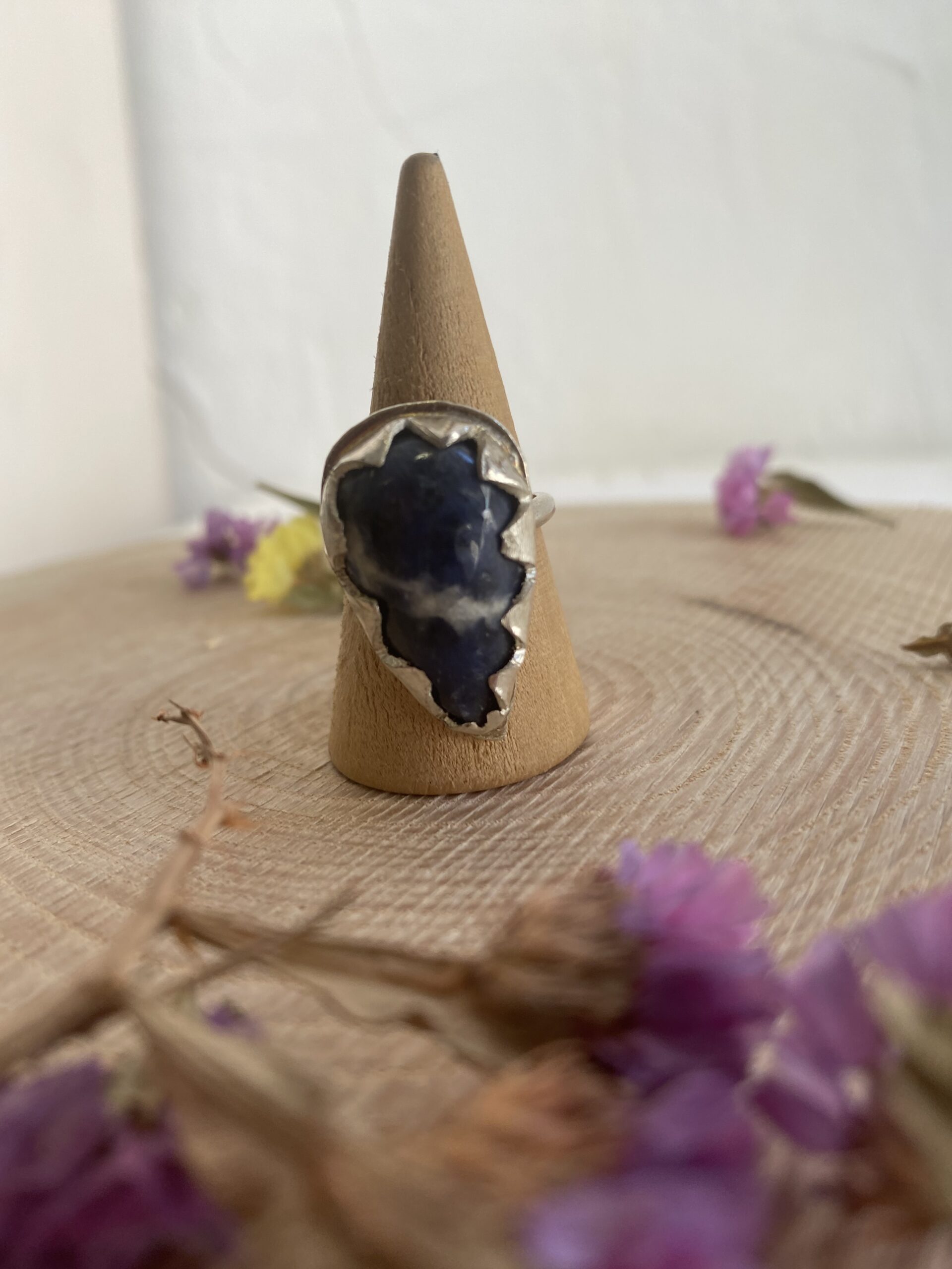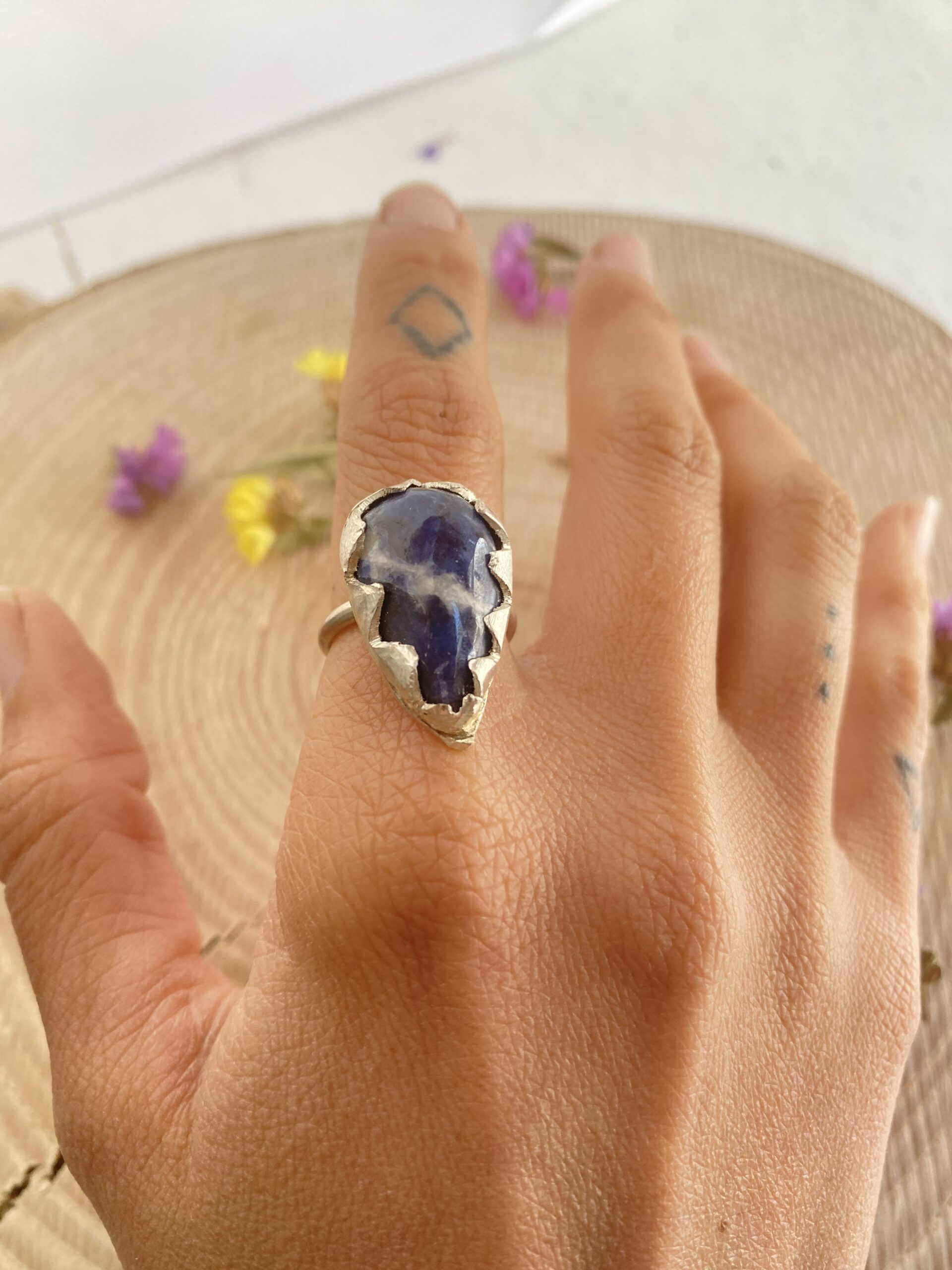 Incorpora sodalita natural, un mineral profundamente conectado con el chakra de la garganta, centro de la comunicación, la expresión y la verdad personal.