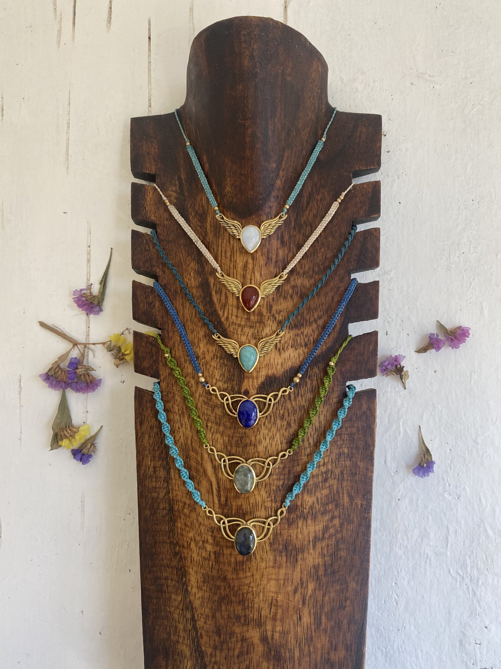 Colgantes tejidos a mano en macramé, elaborados con minerales de alta calidad engarzados en latón.