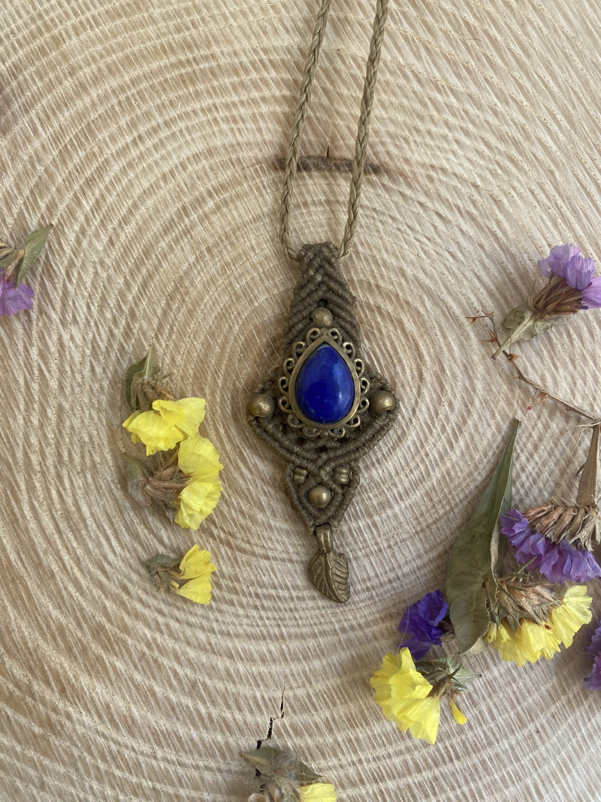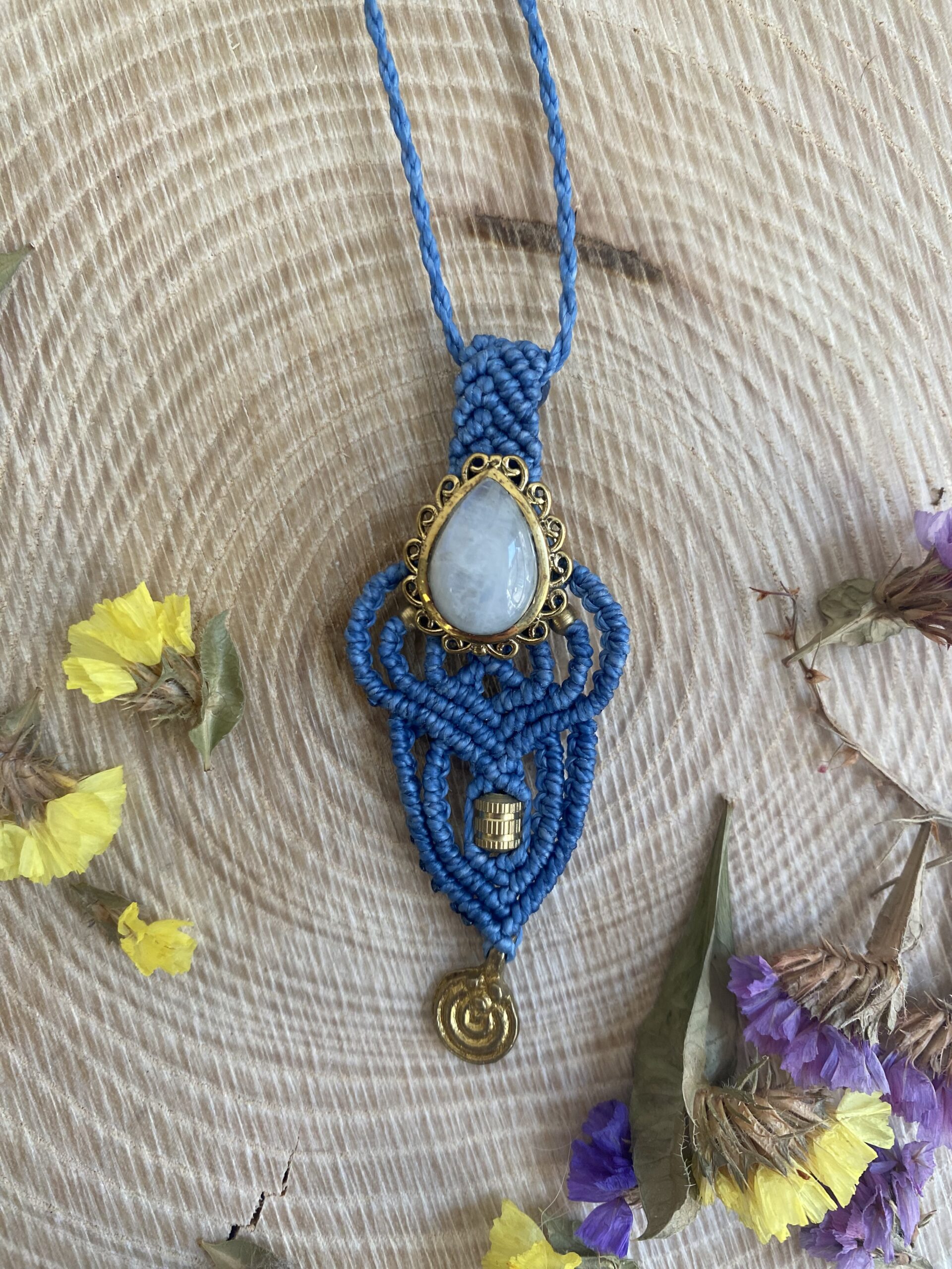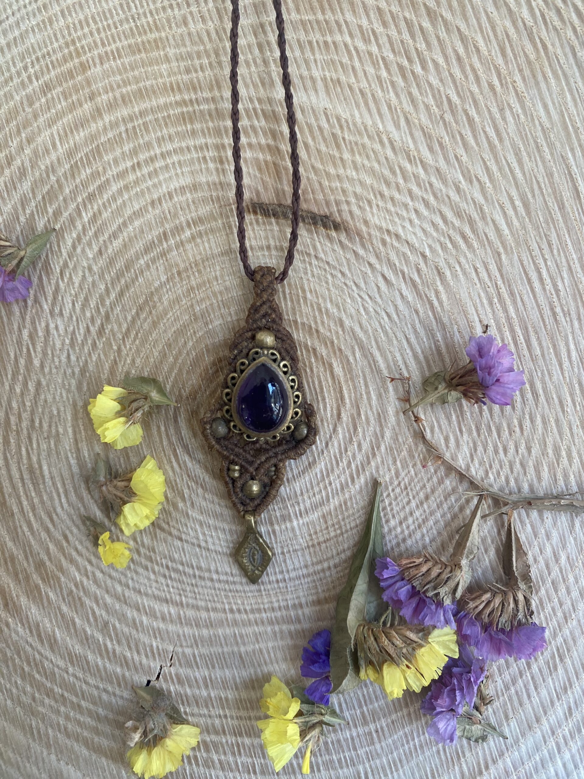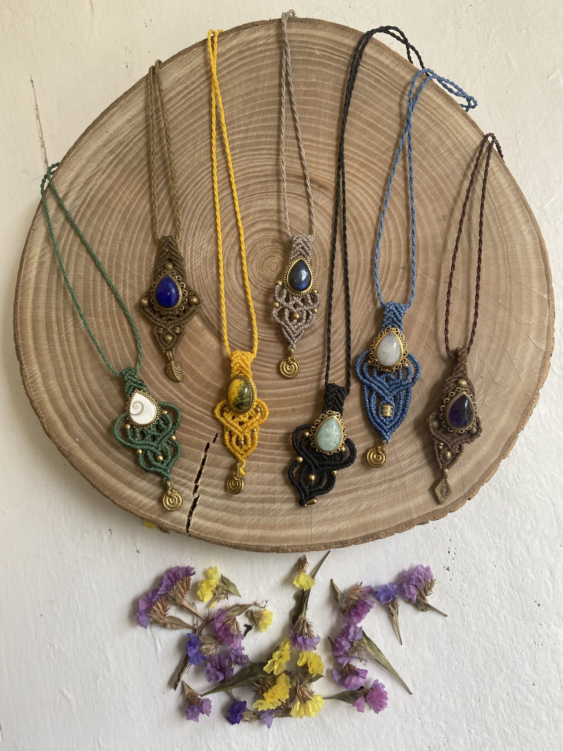 Colgantes tejidos en macramé artesanalmente con diferentes minerales de alta calidad, engarzados en latón.