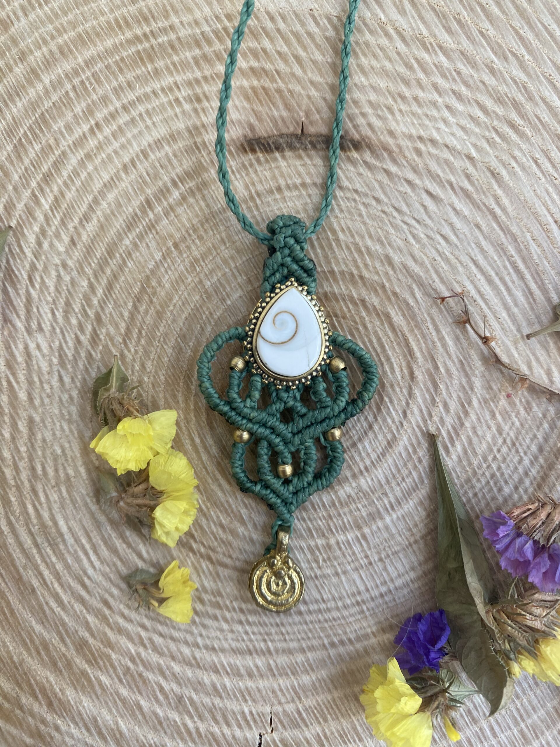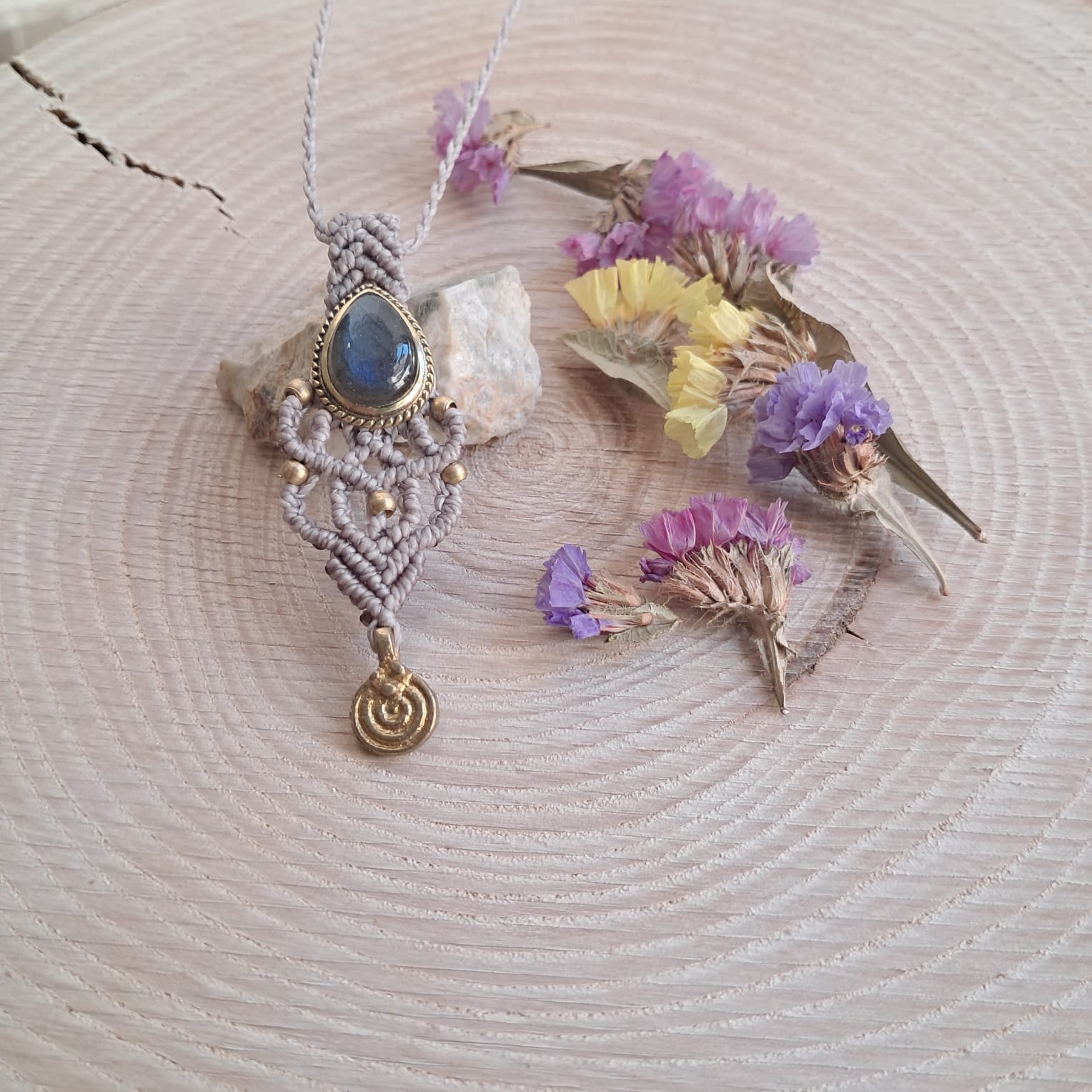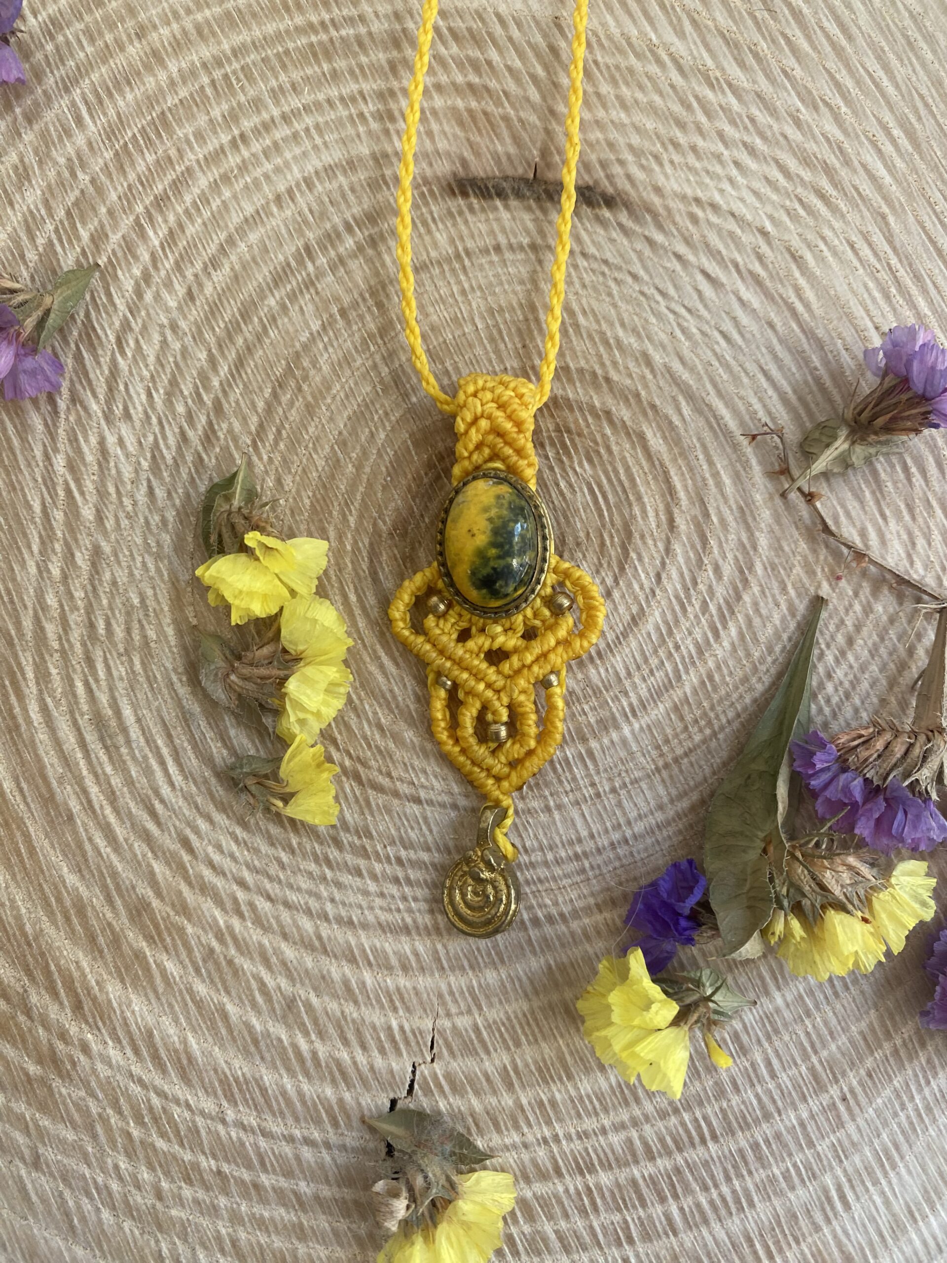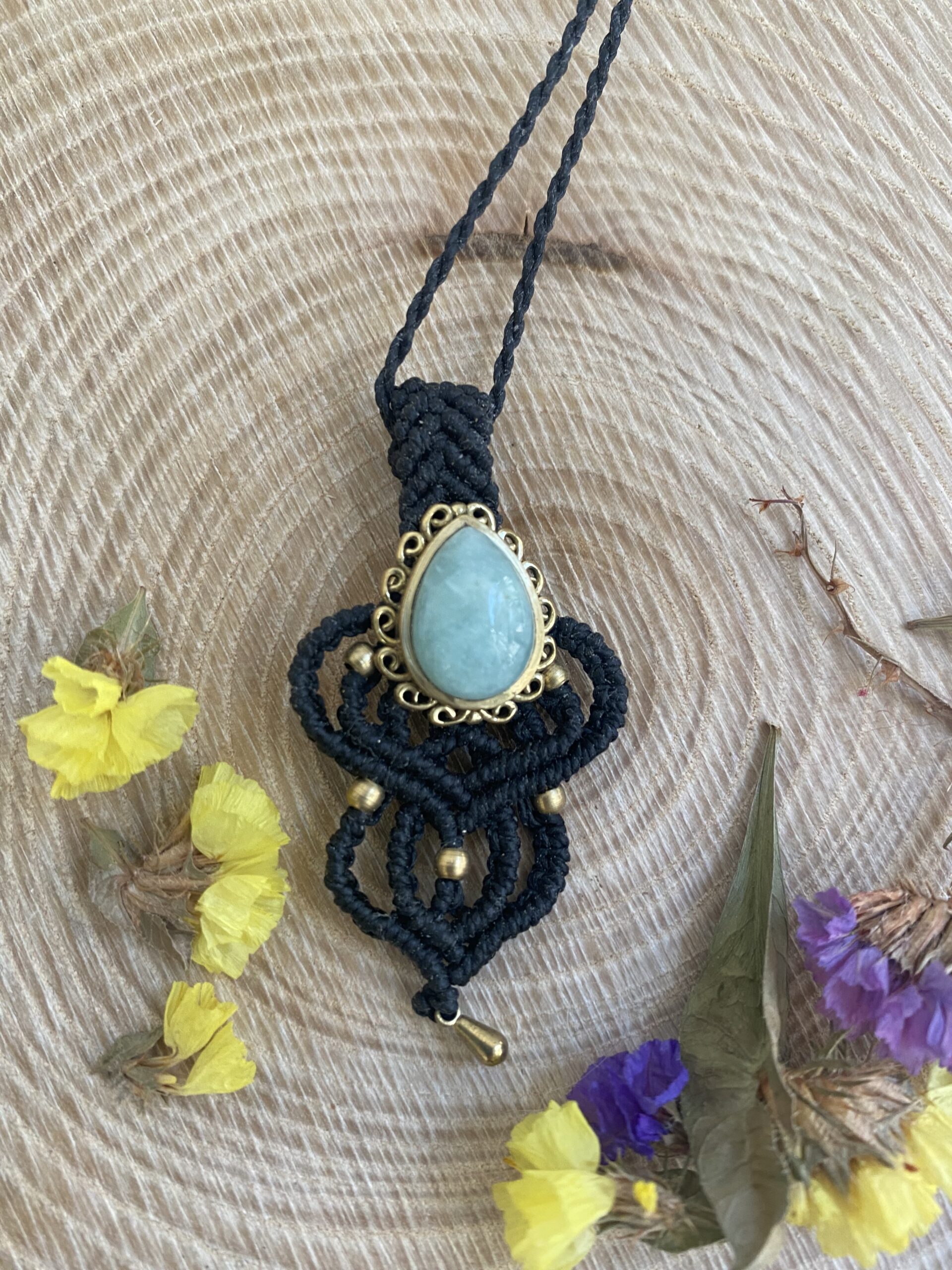 Colgantes tejidos en macramé artesanalmente con diferentes minerales de alta calidad, engarzados en latón.