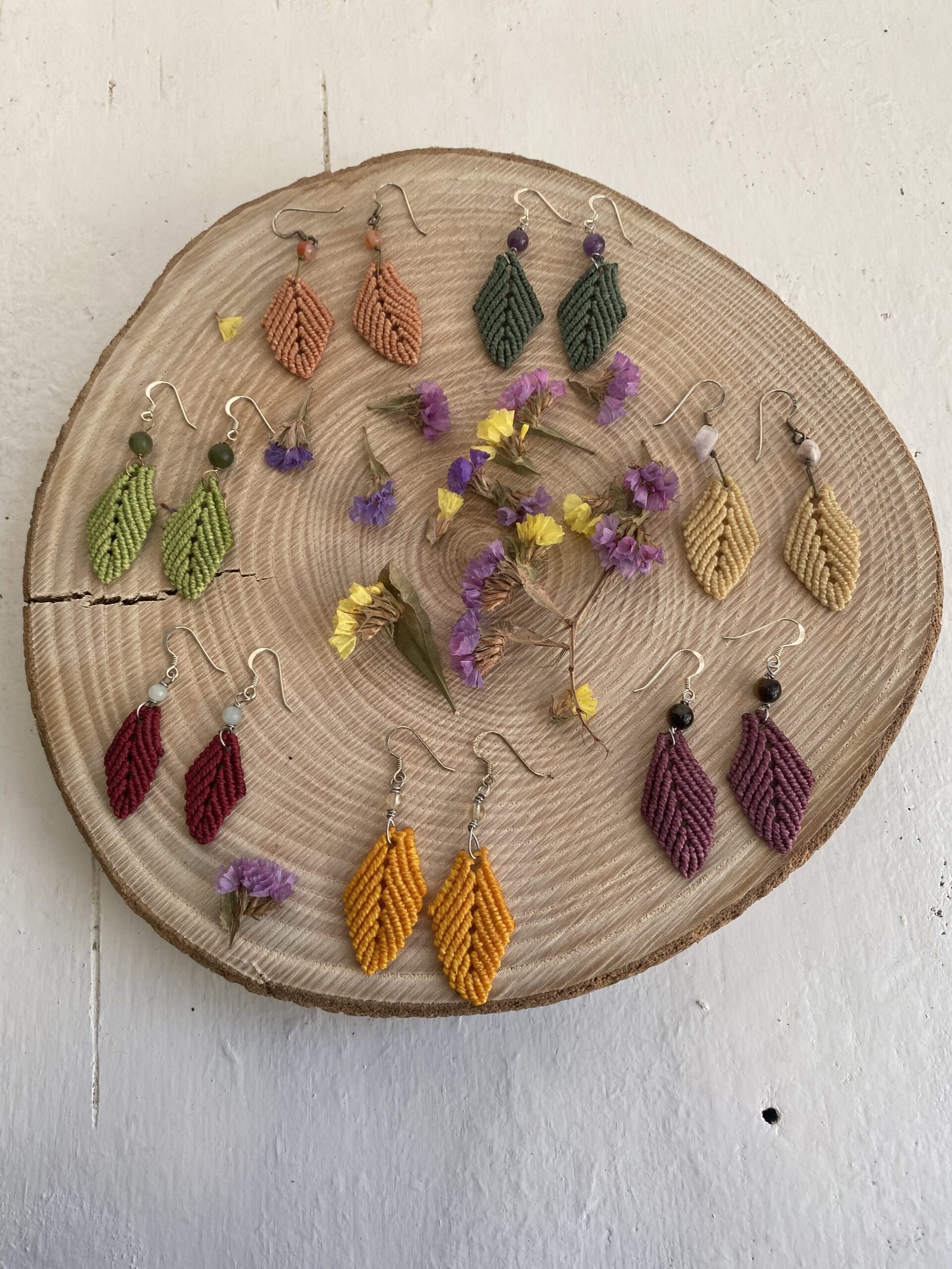 Pendientes en forma de hoja, tejidos a mano en macramé, con ganchos de plata y minerales de alta calidad.